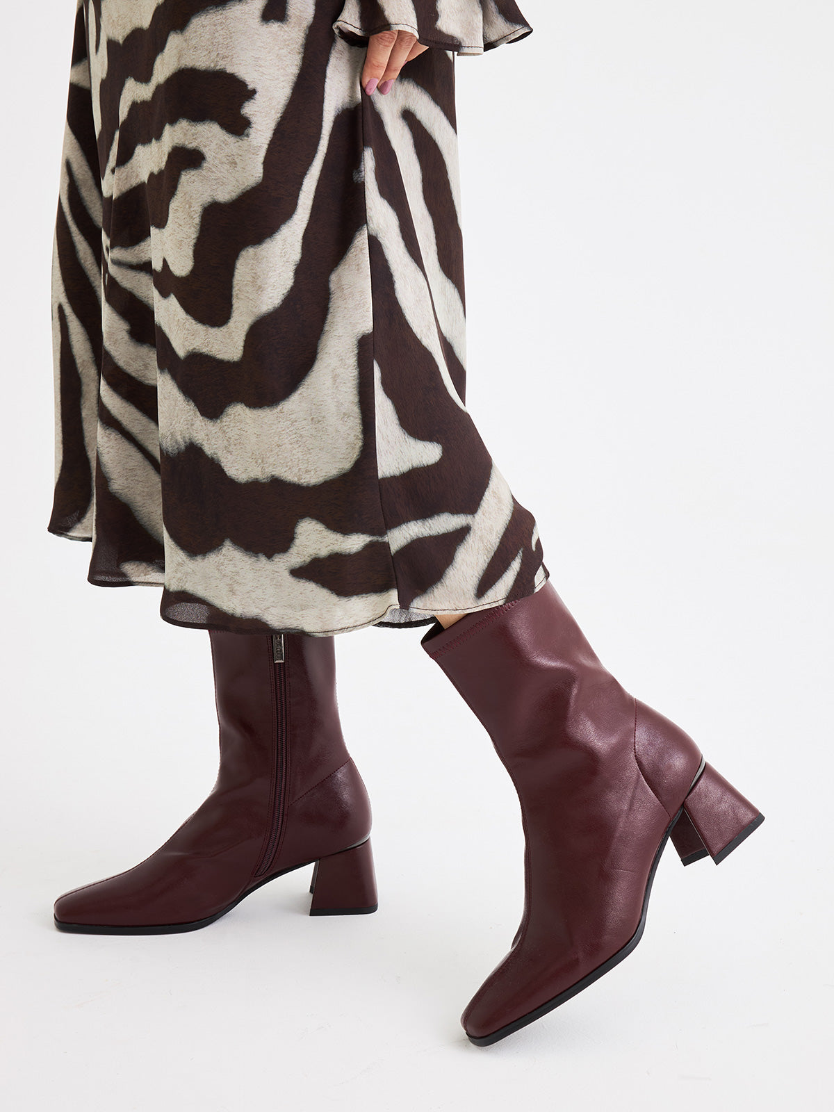 Minimalist design, perfect fit and a touch of elegance. These wine-colored lycra ankle boots are the ideal complement to your seasonal looks. The model is completed with a square heel that stylizes the figure and adds the sophisticated point that every outfit needs.
