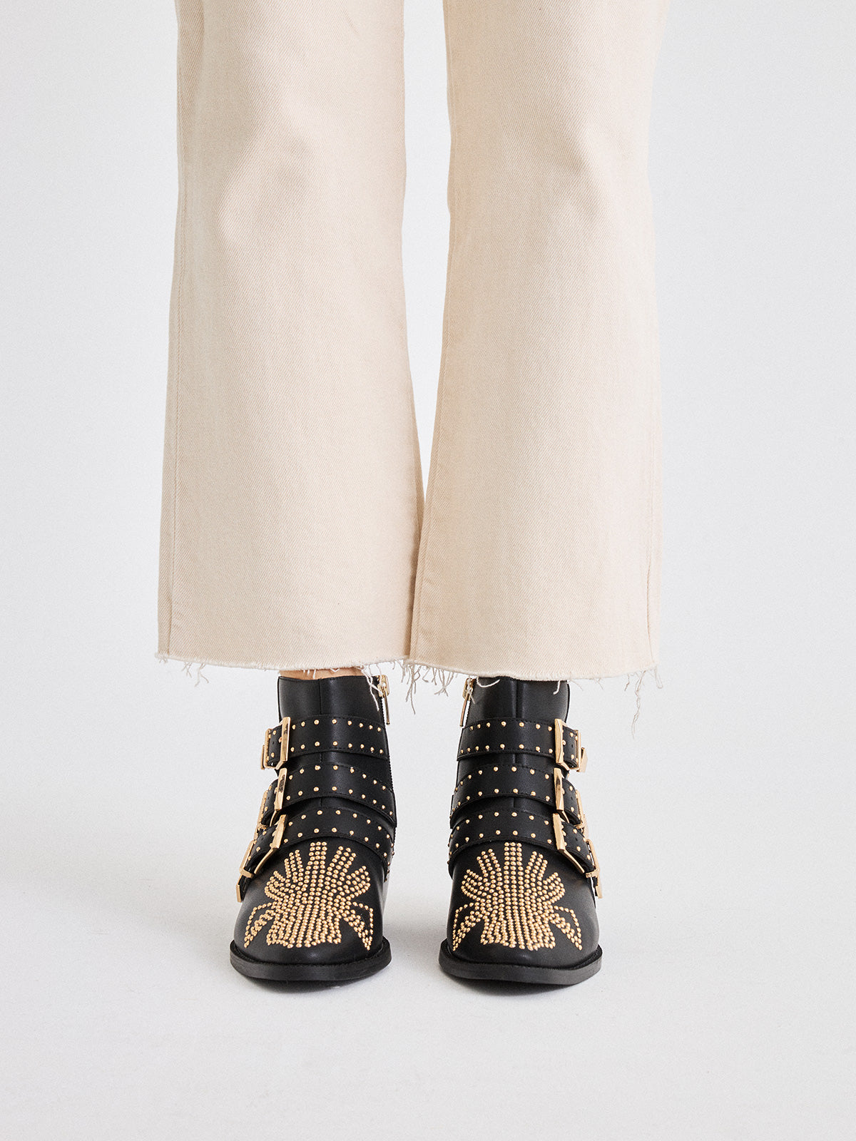 With a rock soul and luxury finishes, this black ankle boot is the key piece to give strength to your looks. Subtle studs and gold buckles not only add contrast, but elevate the design with a sophisticated yet rebellious feel. This model is a must that you can't miss.