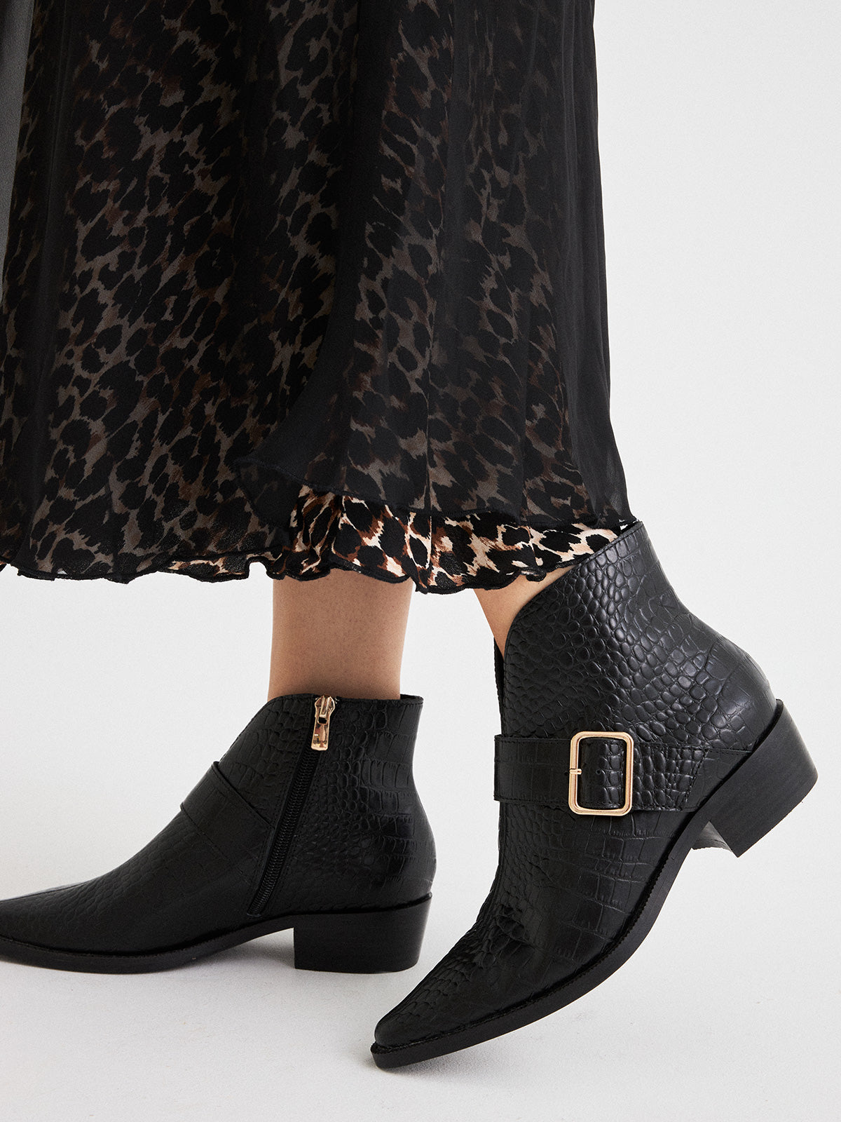 Este botín negro eleva el concepto de básico con una textura efecto cocodrilo que añade profundidad y un aire de lujo discreto. La hebilla dorada, elegante y llamativa, aporta el toque final a un diseño que combina líneas limpias con detalles de impacto.