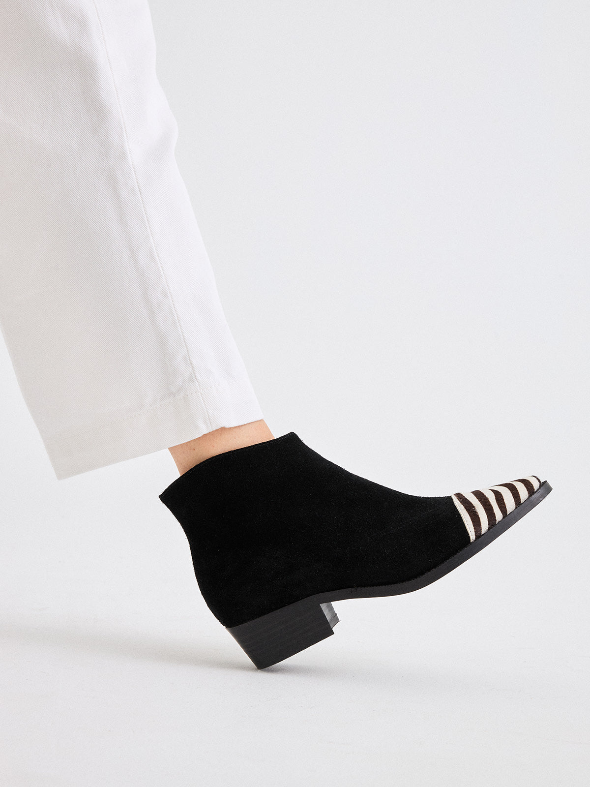 La bottine Milan en daim noir est la définition de l’élégance décontractée avec une touche sauvage. Sa teinte sombre le rend incroyablement polyvalent, tandis que le bout imprimé zèbre ajoute ce détail inattendu qui transforme n’importe quel look et le rend inoubliable.