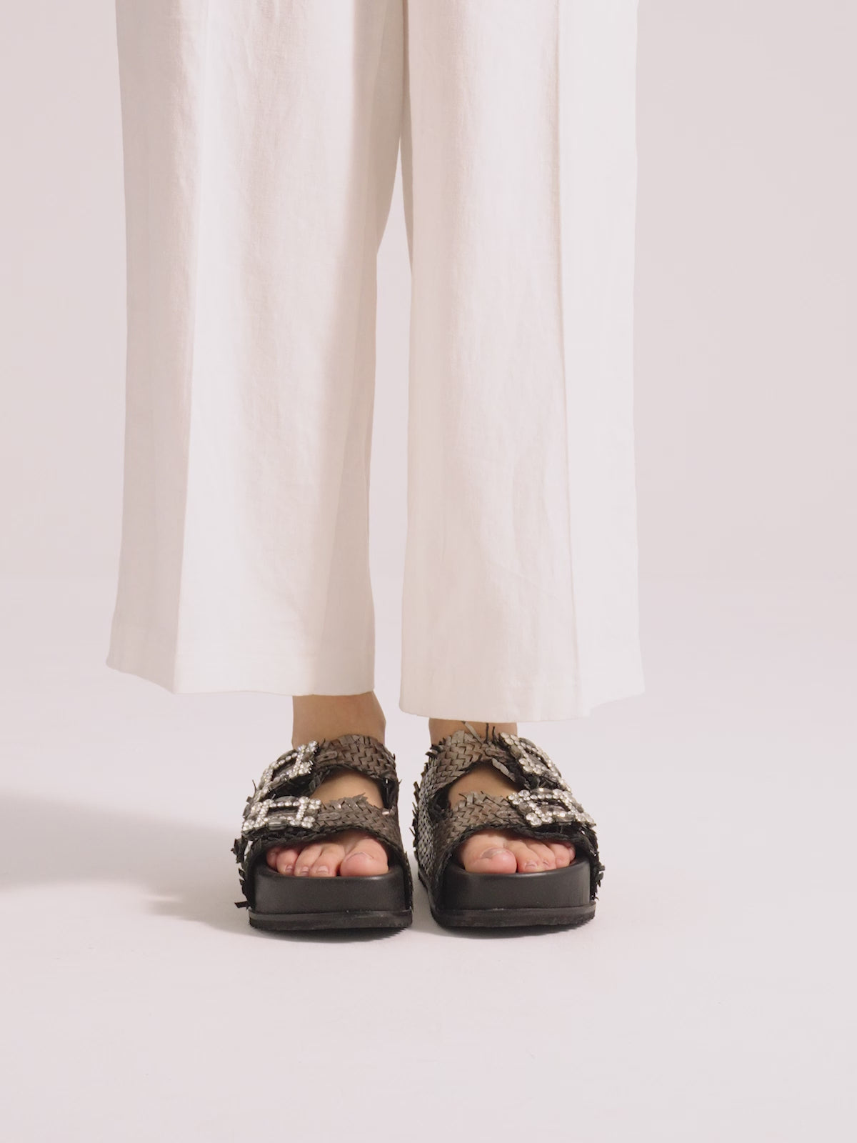 Las sandalias Mary, confeccionadas en lujosa piel, renuevan en clave refinada un modelo clásico de fondo de armario con hebillas de brillantes. El diseño de color pewter se completa con un toque contemporáneo dado por su plataforma interpretando un estilo